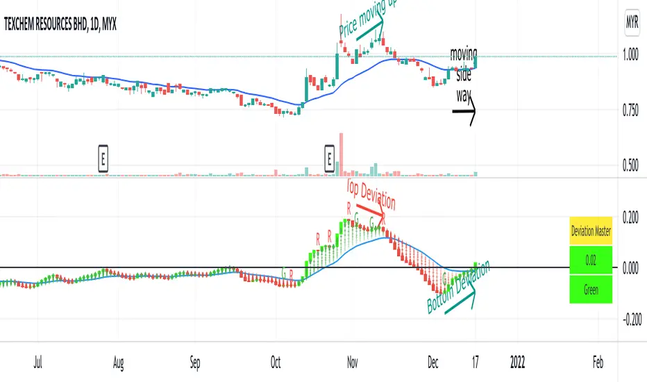 5. Bottom Deviation : while price is moving down or moving side way, Deviation Master is moving up, as shown in the attached chart.