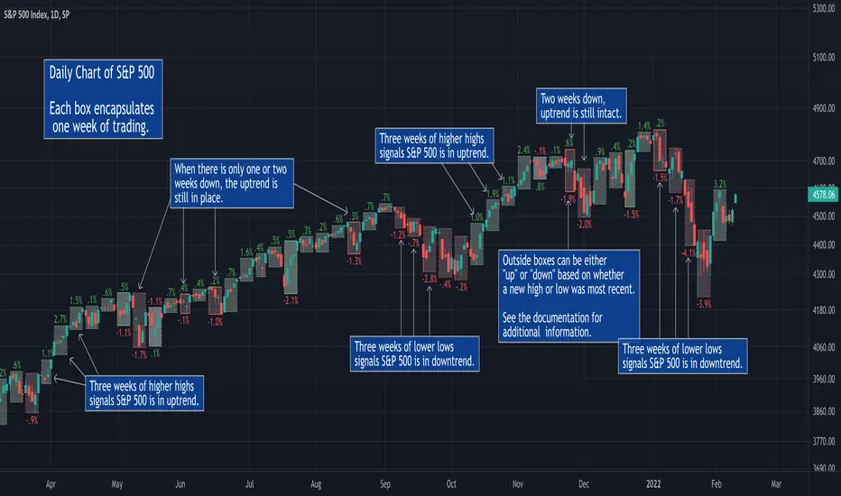 The goal of this indicator is to help spot changes in the trend. Historical price data has shown that movements up/down often occur in threes. By looking for boxes encapsulating higher timeframe moves, we can see when a trend may be changing.