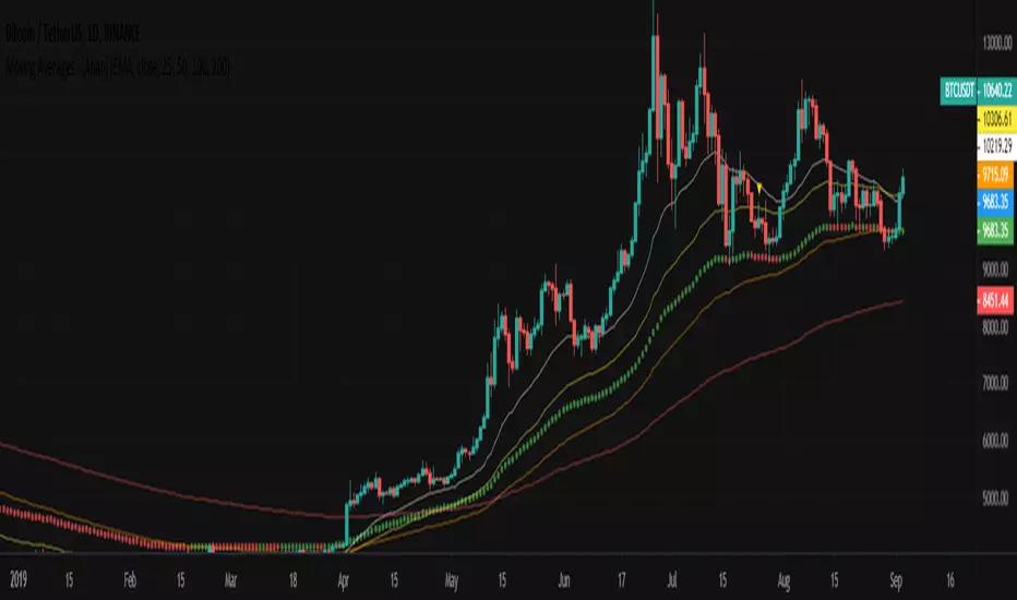 - Types: [SMA, EMA, RMA, WMA, VWMA, Smooth SMA, DEMA, TEMA, Hull MA, ZeroLag EMA, Triangular MA, SuperSmooth MA]