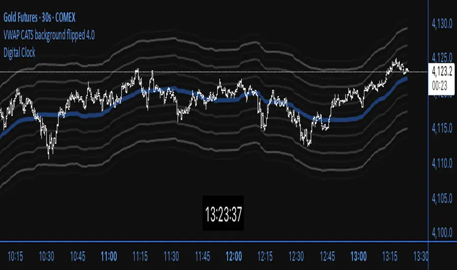 VWAP CATS Background Flipped 4.0 is a sophisticated Pine Script v5 indicator for TradingView that combines a configurable moving average (MA) with dynamic Gann Square of 9 levels to create a multi-layered background shading system for price action analysis. It visualizes support/resistance zones around a central MA (often VWAP or RVWAP) using incremental offsets (either % or absolute points), generating symmetrical bands that resemble a "CATS" (Concentric Adaptive Tiered System) — hence the name.The background is "flipped" in the sense that shading intensity and structure emphasize higher-tier zones, and labels are placed to the right of the chart for future projection.Key FeaturesFeature