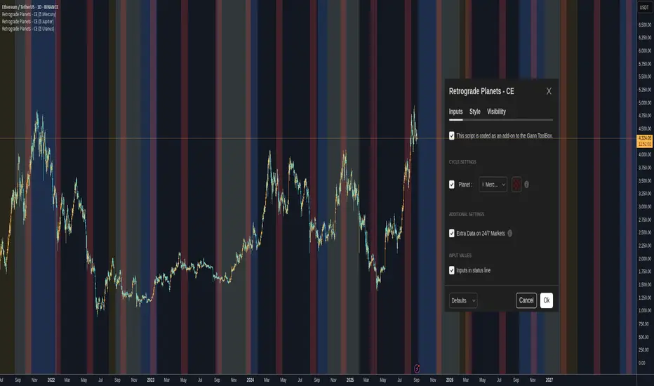 Welcome to the Retrograde Planets - Community Edition, a specialized tool designed to empower traders with W.D. Gann’s time-theory principles by highlighting planetary retrograde cycles. This feature-complete indicator allows traders to visualize critical retrograde periods for market analysis across equities, forex, commodities, and cryptocurrencies. As a seamless add-on to the Gann ToolBox, it enhances time-based trading strategies with precision and clarity.