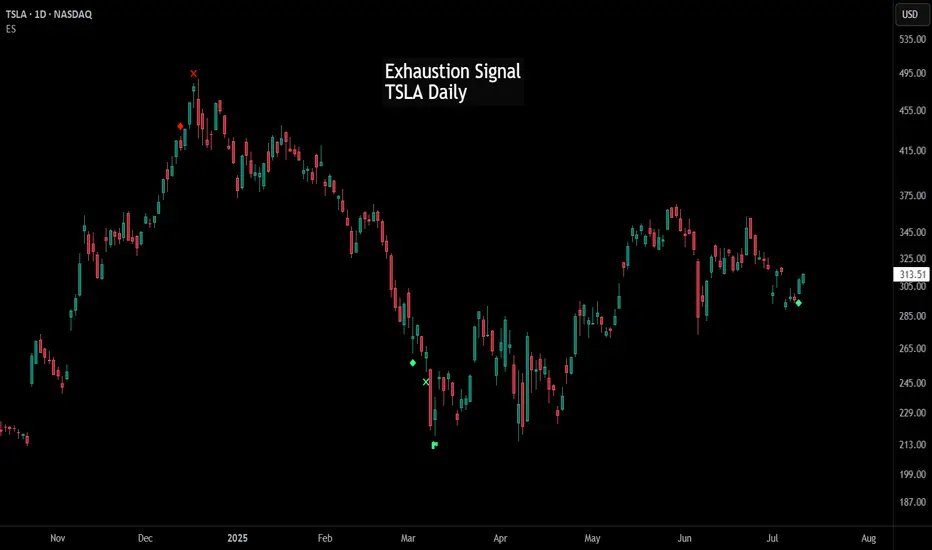 It's important to note that, as per the principles of this approach, the exhaustion signal by itself is not designed to function as a standalone trading indicator. The broader market context and the application of additional analysis techniques influence its significance and potential trading implications.