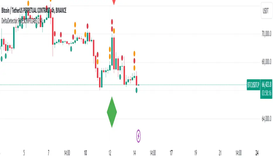 This technical indicator, DeltaDetector PINESCRIPTLABS, is designed to identify significant changes in the price of an asset relative to the previous close. Users can customize the percentage change they want to monitor.