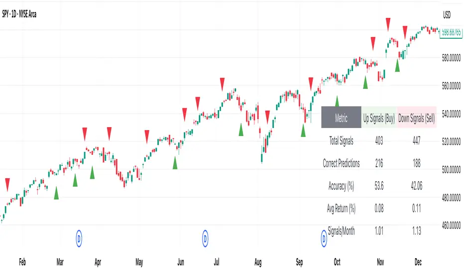 [DEM] Pullback Signal (With Backtesting) is a sophisticated fractal-based indicator that identifies potential reversal opportunities by detecting swing highs and lows followed by pullback conditions in the opposite direction. The indicator uses complex fractal logic to identify pivot points where price forms a local high or low over a customizable period (default 3 bars), then generates buy signals when an upward fractal is identified and the current close is below the previous close, or sell signals when a downward fractal occurs and the current close is above the previous close. This approach captures the classic pullback scenario where price retraces after forming a swing point, potentially offering favorable risk-reward entry opportunities. The indicator includes comprehensive backtesting functionality that tracks signal accuracy, average returns, and signal frequency over time, displaying these performance metrics in a detailed statistics table to help traders evaluate the historical effectiveness of the pullback strategy across different market conditions.