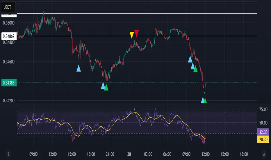 This script calculates extreme dips (blue triangle) or rips (yellow triangle) as likely reversal points, with confirmation long (green triangles) and short (red triangles) triggers occurring on subsequent RSI divergences.