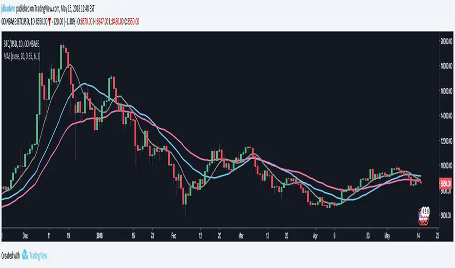 Every type of Moving Average (MA) that is built into TradingView, rolled into one color-coded Moving Average Selector (MAS). Mix-n-match and compare all seven: 1) Simple Moving Average (SMA), 2) Exponential Moving Average (EMA), 3) Running Moving Average (RMA), 4) Symmetrically Weighted Moving Average (SWMΑ), 5) Volume-Weighted Moving Average (VWMA), 6) Weighted Moving Average (WMA), and/or 7) Arnaud Legoux Moving Average (ALMA).