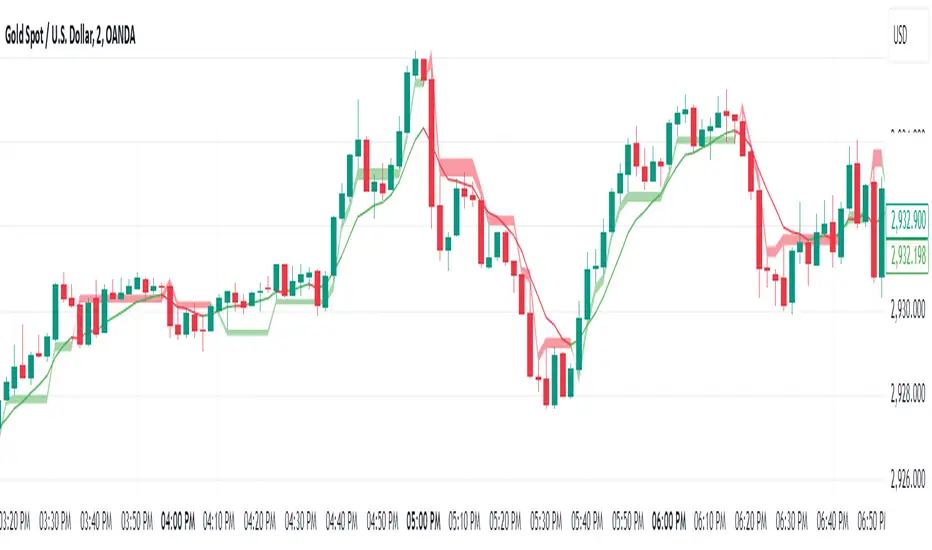 Green Cloud: When the price is above both the high EMA and the low EMA, it signals a bullish trend, and the cloud turns green.