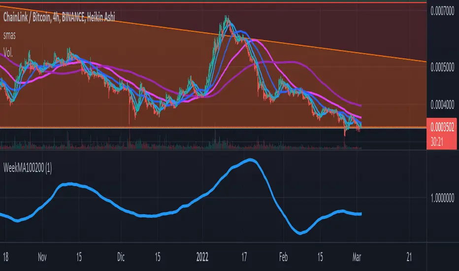 It plots the ratio between the MA of 100 periods and the MA of 200 periods. It can be used to observe volatility and market peaks and lows. The change in concavity of the function indicates the peak or the low rather than the peaks and lows of the plot itself.