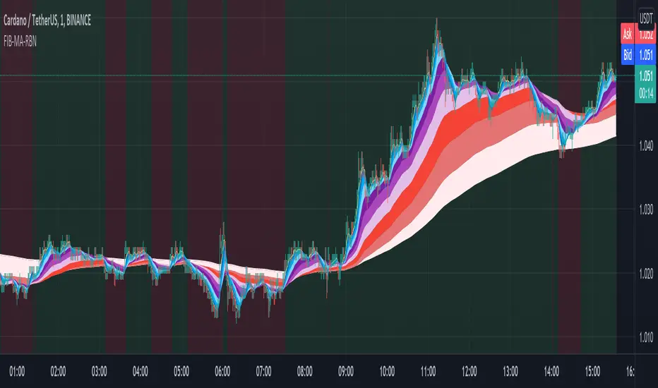 This indicator exemplifies the beauty of the sacred Fibonacci sequence.... used by flowers and seashells and the intrepid day trader. Each color in the ribbon represents an MA of a specific FIB lookback period. This naturally makes the ribbon front weighted, giving recent price action greater importance than older price action. The undulating curls of the ribbon allow a trader to see key convergences and divergences. The ribbon often narrows before a major price movement.