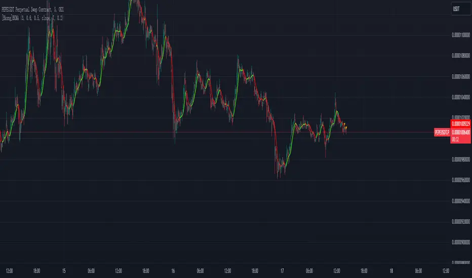 8. **Color Determination:** The color of the indicator line is determined based on the smoothed changes in the adaptive moving average. If the change is greater than zero, the line is green, indicating an upward trend. If the change is less than zero, the line is red, indicating a downward trend.