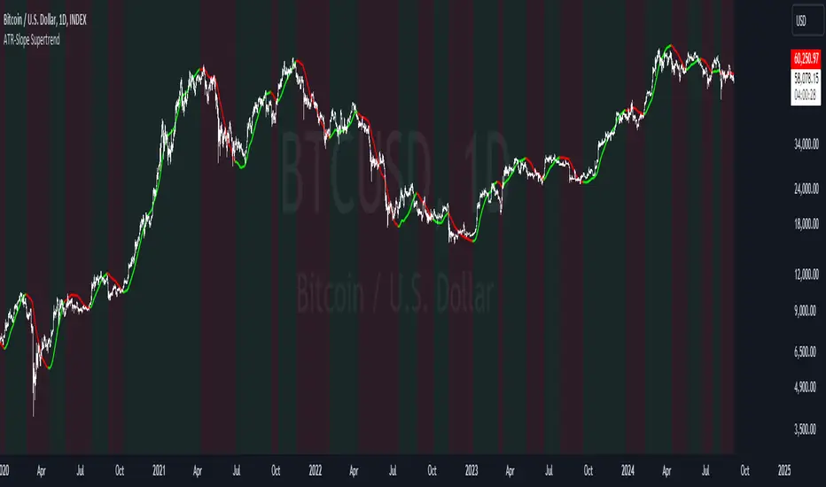 The "ATR-Slope Supertrend" indicator combines the Linear Regression Moving Average (LSMA) and the Average True Range (ATR) to determine market trends. It calculates the LSMA and its slope to identify uptrends and downtrends based on the price's position relative to a smoothed ATR.