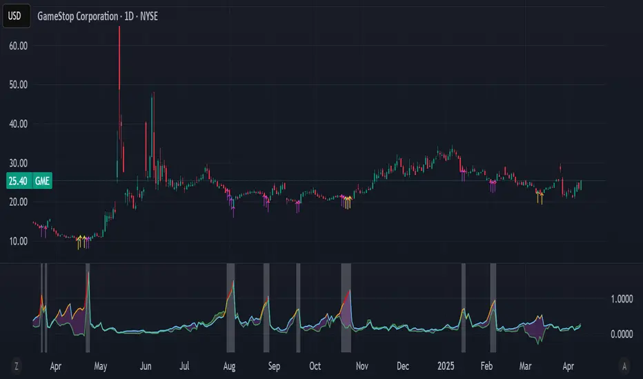 I added purple arrows showing when the indicator triggers and yellow arrows showing when lady gobble is making an appearance.