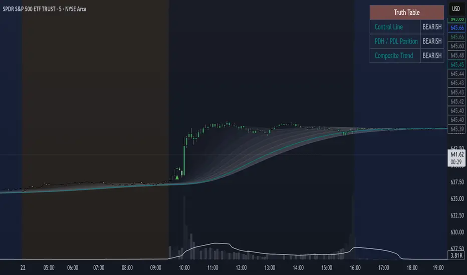 This tool implements a “prove-it” breakout framework around prior-day levels. It (1) anchors Previous Day High/Low (PDH/PDL) to RTH, (2) reveals anchored ghost targets only after price proves itself beyond PDH/PDL, and (3) confirms direction using a 3-consecutive-closes rule. A compact Truth Table summarizes regime: Control Line, PDH/PDL position, and a microstructure-based composite trend score. Everything is designed to work together to filter fake breaks and provide objective upside/downside targets.