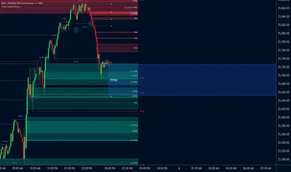 The Troop Toolkit indicator solves a major workflow problem that has never been automated before on TradingView. The most important piece: automatic detection of First Fair Value Gaps (FFVGs) and their proper conversion into Inversion First Fair Value Gaps (IFFVGs). These two concepts require strict rules, swing validation, multi-timeframe comparison, and invalidation logic that traders can currently only do manually. There is no other indicator on TradingView that handles FFVG + IFFVG logic correctly across multiple intraday timeframes at once. Before this tool was created, traders had to manually scan five different timeframes every day and track every first fair value gap that formed after a significant high/low was formed. This took hours each week and was prone to inconsistencies. Troop Toolkit automates the entire process with clear validation rules, making this the first indicator to fully operationalize FFVG + IFFVG workflow.