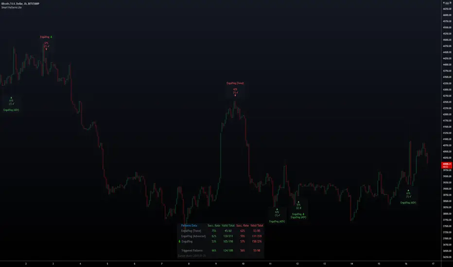 This lite version of Smart Patterns script specifically focuses on different Engulfing Pattern approaches, and tracks their performance and success rate over time.