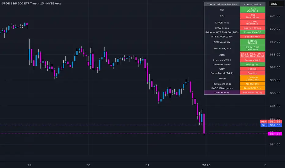 **Welcome to Trinity Ultimate Pro Plus**, a comprehensive, multi-indicator trend dashboard designed for TradingView using Pine Script v5. This powerful tool aggregates signals from up to **11 core technical indicators** (plus an ADX strength bonus and divergence penalty) to provide a clear **overall bias**—**BULLISH**, **BEARISH**, or **NEUTRAL**—helping you assess market trend confidence at a glance. It's ideal for traders in **stocks**, **forex**, and **crypto**, whether you're day trading on lower timeframes or swing trading on higher ones. The indicator overlays on your chart but primarily displays information in a **customizable dashboard table**, making it non-intrusive while delivering actionable insights. By emphasizing **confluence** (agreement among indicators), it aims to reduce false signals and boost your trading decisions. Recent updates have enhanced reliability, particularly for **ADX** (now with directional +DI/-DI values displayed for transparency) and **Aroon** (clamped to prevent calculation overflows, ensuring accurate 0-100 values). Note that while robust, it's not a standalone strategy—always combine it with your risk management and market analysis.