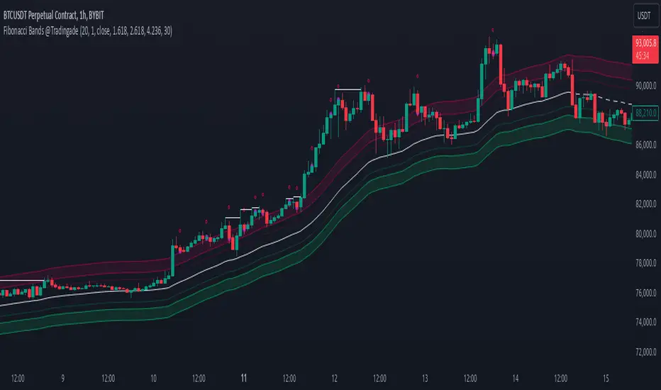 The Fibonacci Band indicator helps traders find key support, resistance, and mean reversion levels using Fibonacci ratios. It adds three bands (38.2%, 61.8%, and 100%) around a central trend line, adjusting with price changes. This makes it easy to follow trends, see possible liquidity zones, and identify reversals for better trade entries and exits.