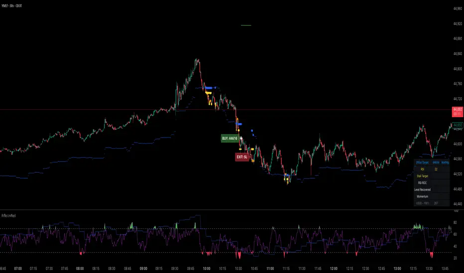 This script is designed for use on 30-second charts of Dow Jones-related symbols (YM, MYM, US30). It provides automated buy and sell signals using a combination of price action, RSI (Relative Strength Index), and volume analysis. The script is intended for both live trading signals and backtesting, with configurable risk management and debugging features.