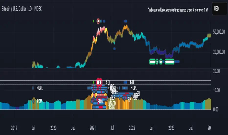 You can use this indicator to help you understand when the BTC price is more likely topping based on past performance of these indicators. This indicator pairs with the BBI (Bitcoin (BTC) Bottom Indictor) and the BTB (Bitcoin Top and Bottom indicator).