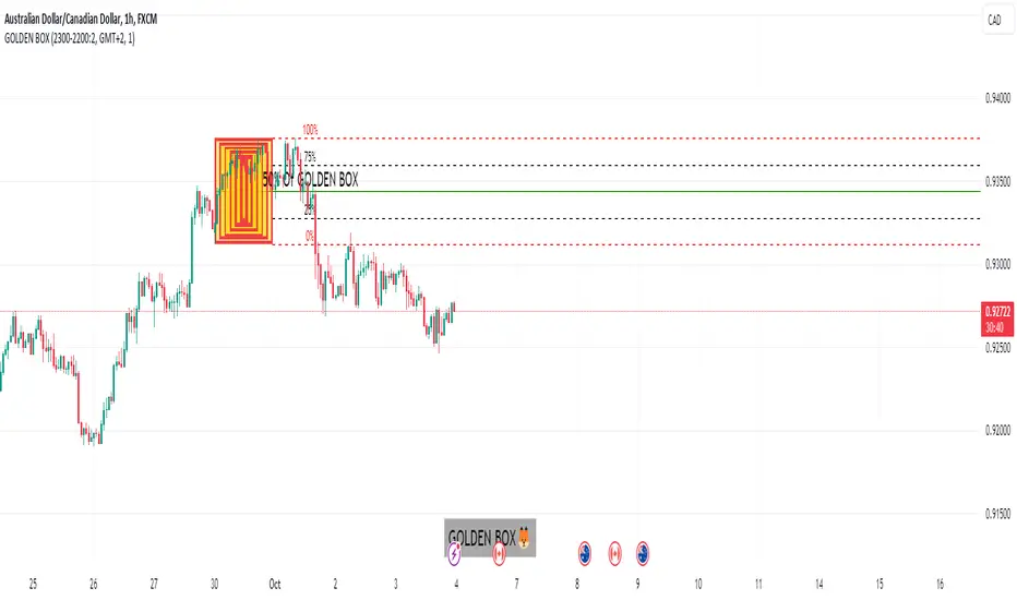 The "Golden Box" trading strategy indicator is a visual tool designed to facilitate the execution of the Golden Box trading strategy on the TradingView platform. This strategy involves identifying potential buy and sell signals based on specific price movements within defined trading sessions.