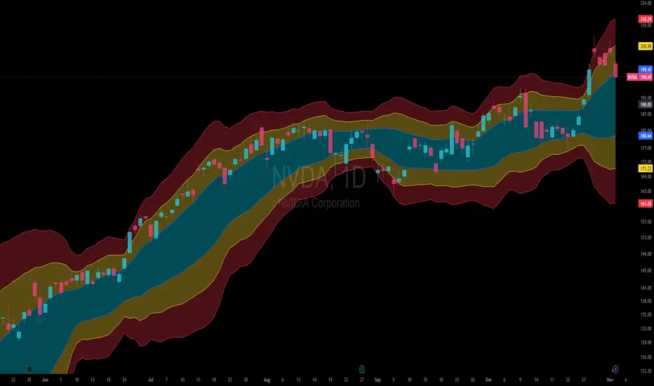 You can choose your preferred basis type—SMA, EMA, RMA, or Linear Regression—and decide whether to force monthly data even on lower timeframes for consistent macro analysis. Adjustable parameters include length, sigma multipliers, and standard deviation smoothing for fine-tuning sensitivity. The script automatically fills the space between the bands, creating a layered color map that clearly shows each volatility zone.