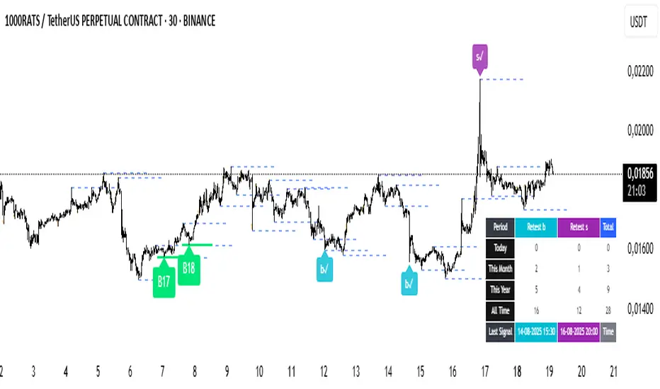 Tracks price return to main signal levels (B/S lines) after initial signals