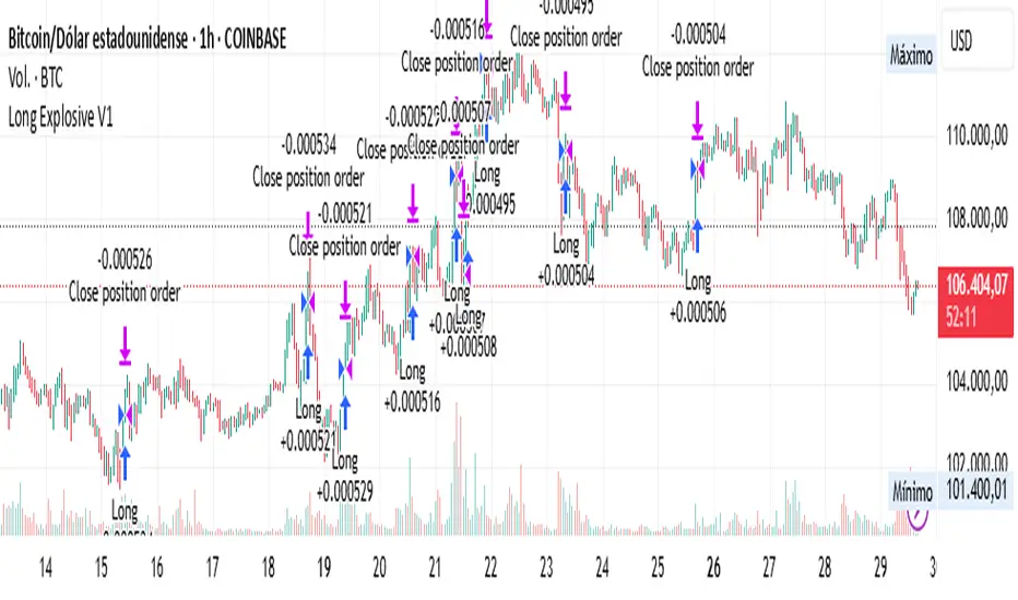 The “Long Explosive V1” strategy calculates the percentage change in price from the last closing price of the candlestick, so that if it increases by a certain percentage it goes long, but if it decreases by another percentage it sends an exit order, so that the percentage limits above and below the current price function as inherent stop loss and take profit, with the benefit of taking advantage of the volatility of the bull market.