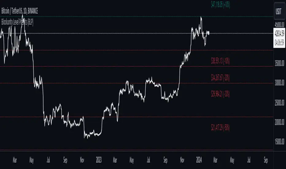 Level Presets (BLP) is a simple tool for setting upside and downside levels relative to the current price of any asset. In this way, you can track which price the asset needs to move towards in order to achieve a defined performance.