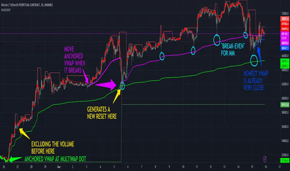 For any timeframe, I recommend starting zoomed way out. Find the last green dot and drop an "Anchored VWAP" there. Now, zoom in until that candle is no longer visible. Find the last green dot and drop an anchored VWAP there. Continue doing so until you notice the lower VWAP getting reset to basically the same place.