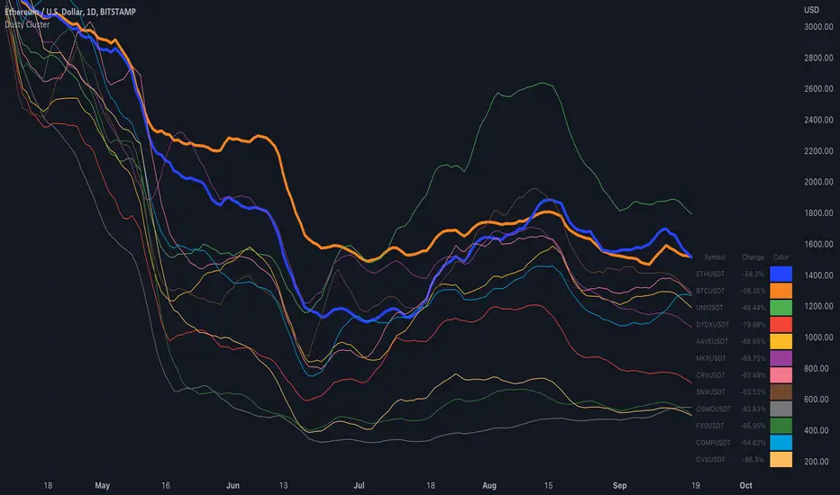 Dusty Cluster is a quick way to compare ETH and BTC against different crypto categories such as DeFi, L1’s and more. The comparison start date is adjustable for analyzing performance of different time periods. It is possible to apply adjustable plot line smoothing for improving visibility.