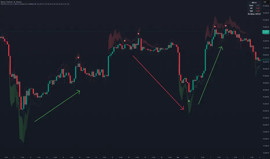 The Reversal Score System v3 (RSS3) is a sophisticated multi-component indicator designed to identify potential market reversal zones by combining volatility pressure analysis, trend momentum measurement, and divergence detection. The system generates a normalized score ranging from -1 (bullish) to +1 (bearish), with visual cloud overlays highlighting high-probability reversal areas. RSS3 integrates multi-timeframe confirmation and adaptive divergence filtering to reduce false signals in strong trends.