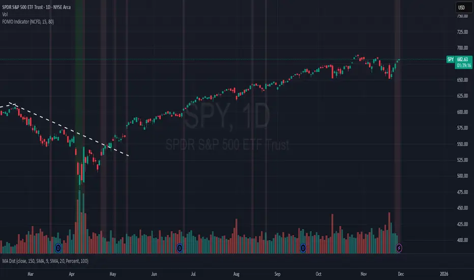 Overlays overbought/oversold signals using NCFD on a chart. High FOMO tends to signal high likelihood of a pullback; low tends to signal high likelihood of a bounce. Generally used for risk management and timing entries.