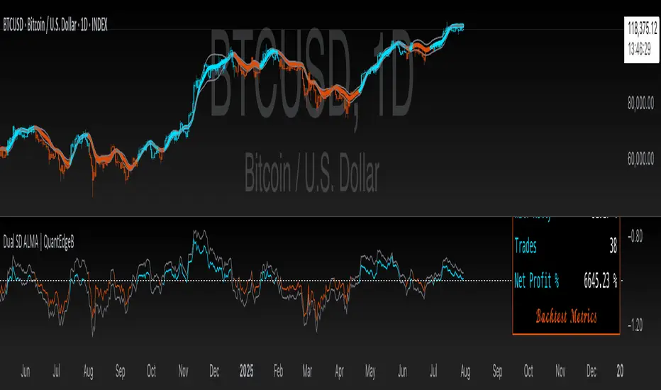 The "SD ALMA " indicator is a sophisticated trend-following tool that uses ALMA combined with standard deviation bands to adapt to market conditions. By requiring dual confirmation from both weighted and normalized SD-based signals, it filters out weak signals and increases reliability. This tool is valuable for traders who seek smoother trend signals and adaptive filtering, allowing them to respond better to market shifts and potential trend reversals.