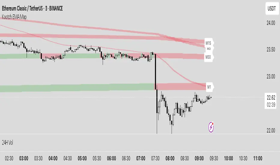 Kootch EMA overlays the 200 EMA from M1, M5, M15, M30, H1, H4, and D1 on any chart so you always see where higher and lower-timeframe trend gravity actually is. It also builds an optional Fib channel between the most extreme MTF 200 EMAs (min/max), giving you clean intrachannel targets and confluence zones.