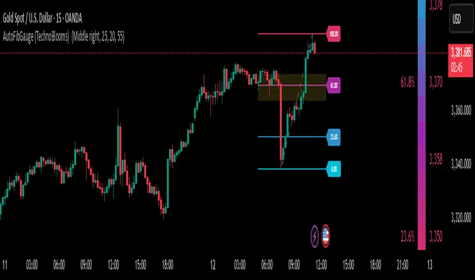 AutoFibGauge help users to understand Fibonacci retracement with auto-drawn levels from previous candes, dual moving average crossover for trend confirmation, and a thermometer for quick Fib level identification.