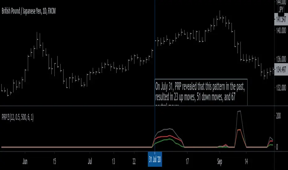Note: PRP doesn't give you actual probabilities, but gives you instead the historical occurrences of up, down, and neutral moves that resulted after the pattern. So you can calculate probabilities based on these valuable statistics. So for example, PRP can tell you this pattern has historically resulted in 55 up moves, 20 down moves, and 60 neutral moves.