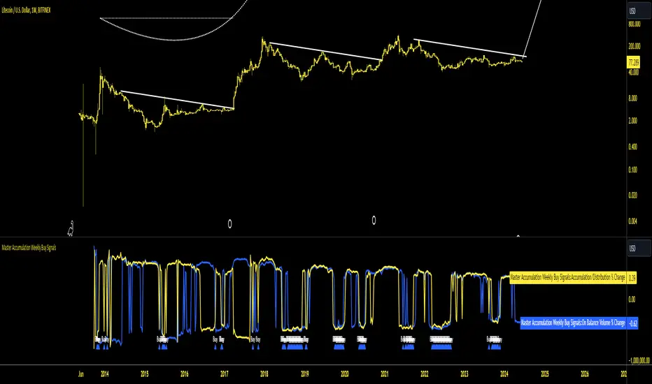 The Master Accumulation Weekly Buy Signals indicator is designed to help traders identify potential buy opportunities based on the accumulation and distribution of volume, with a primary focus on weekly timeframes. This indicator combines the On Balance Volume (OBV) and the Accumulation/Distribution (AD) indicators to generate buy signals when both metrics show a decline.