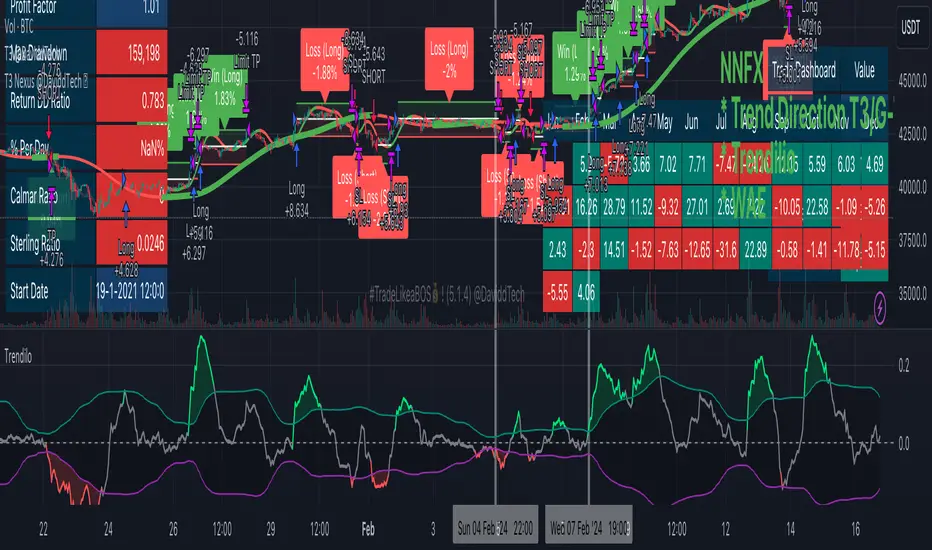 2. **Trendilio**: Serving as a confirmation tool, the Trendilio indicator is utilized to verify the trend direction identified by the Trend Direction T3. It provides a visual representation of the trend's strength and sustainability. A green signal from Trendilio in an uptrend or a red signal in a downtrend adds confidence to the trade decision, ensuring that only robust trends are considered for trading.