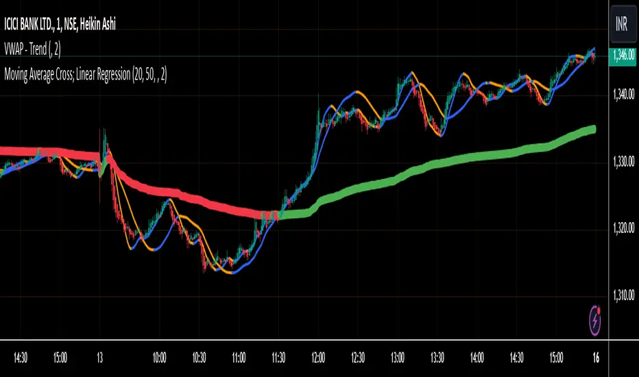 This Pine Script calculates the Volume Weighted Average Price (VWAP) for a specified timeframe and plots its Linear Regression over a user-defined lookback period. The regression line is color-coded: green indicates an uptrend and red indicates a downtrend. The line is broken at the end of each day to prevent it from extending into the next day, ensuring clarity on a daily basis.