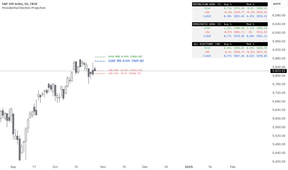 This indicator analyzes historical price movements during US Presidential elections from 1972-2020. It provides projected price levels based on normalized percentage moves from the daily open, helping traders understand potential price action on the election day.