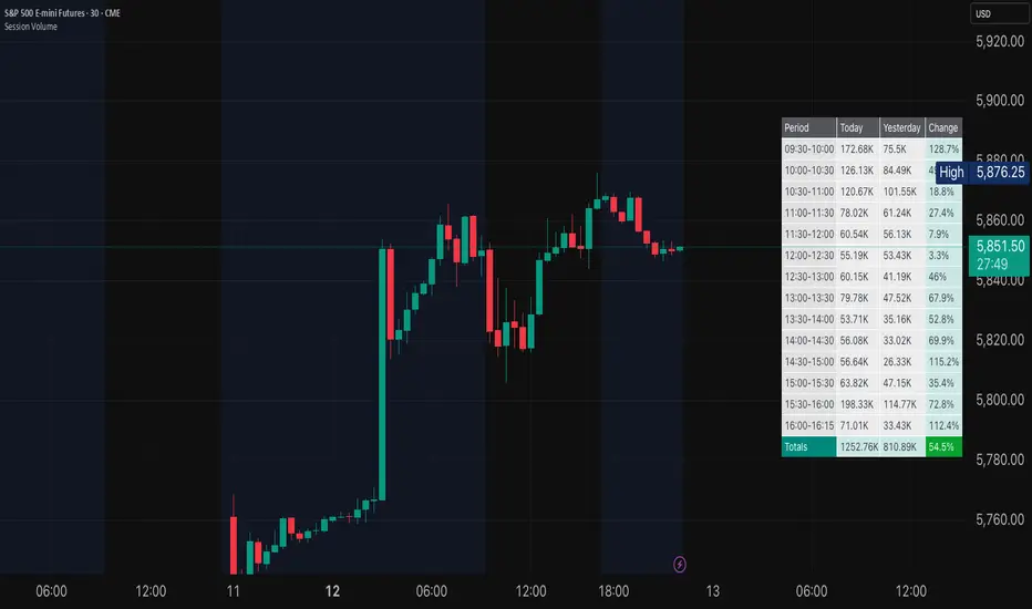This script tracks and displays 30-minute volume segments during the Regular Trading Hours (RTH) session. It allows traders to visually compare each time block’s volume today vs. the same block from the previous day, helping spot early signs of strength, weakness, or divergence.