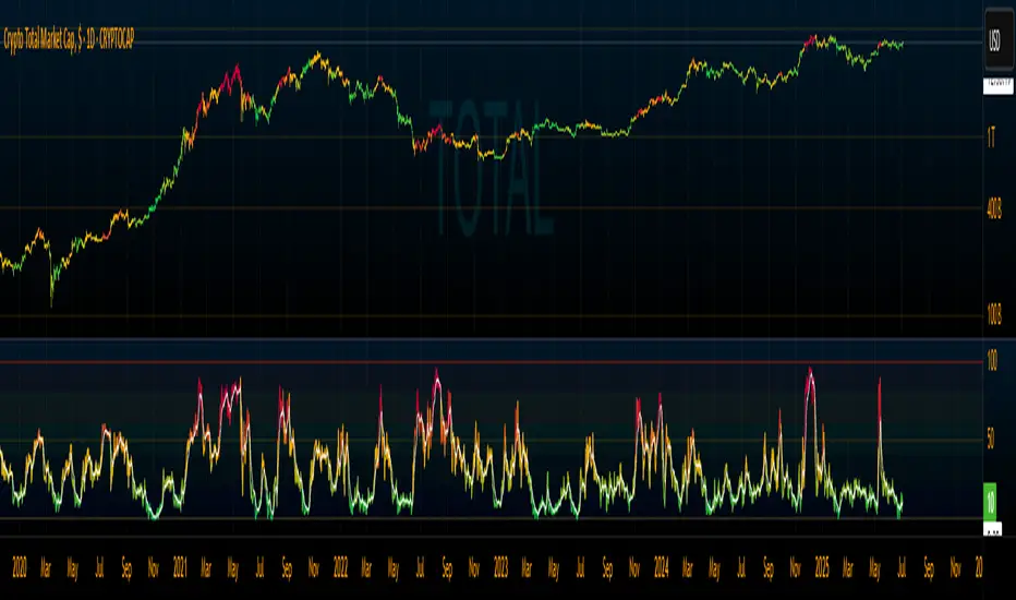 Each altcoin pair (e.g., BNBBTC, XRPBTC) is assigned a score of 1 if its price is above the EMA, or 0 if below. The indicator displays: A line plot of the total score, color-coded using a gradient to reflect market strength (green for lower scores, transitioning to red for higher scores).