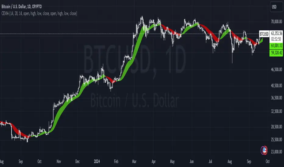 This script contains two exponential moving averages. Modified slightly, this script previously contained an ema, and sma. I've also attempted to smooth out the signal by taking an average of the open, high, low, and closing price.