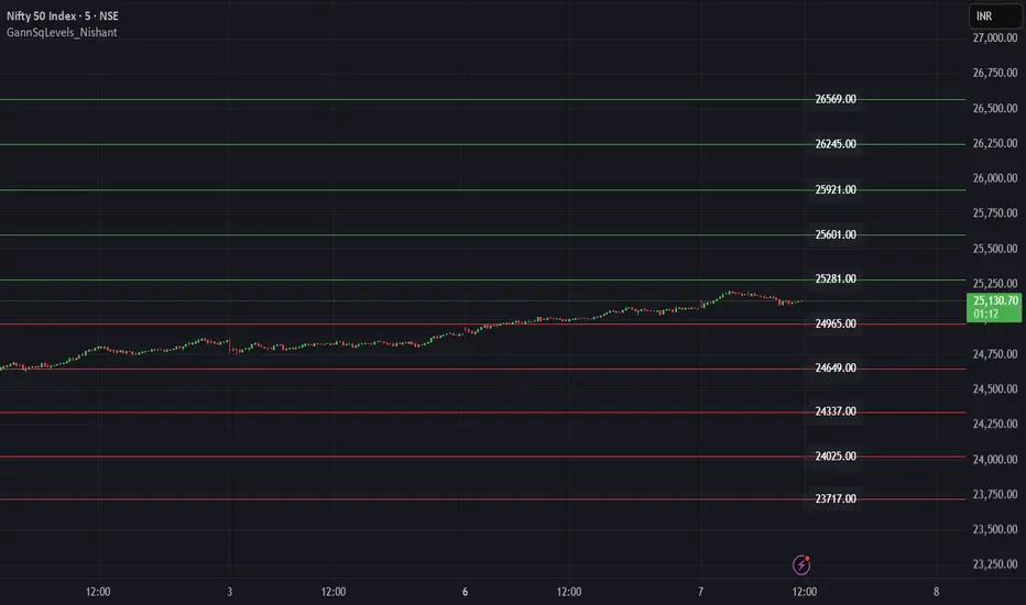 This indicator plots dynamic horizontal price levels based on the squares of whole numbers (1², 2², 3², …) with a small adjustment rule: if a square ends with an even digit, 1 is added to make it odd (for example, 4² = 16 → 17). The script displays a configurable number of the nearest levels above and below the current price and updates automatically as price moves.