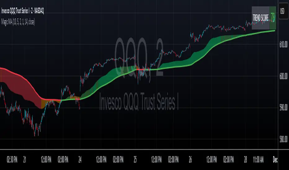 Instead of juggling multiple moving averages, The Magic MA condenses them into a unified scoring model that updates in real-time, highlighting when the market is strong, weakening, or about to shift.