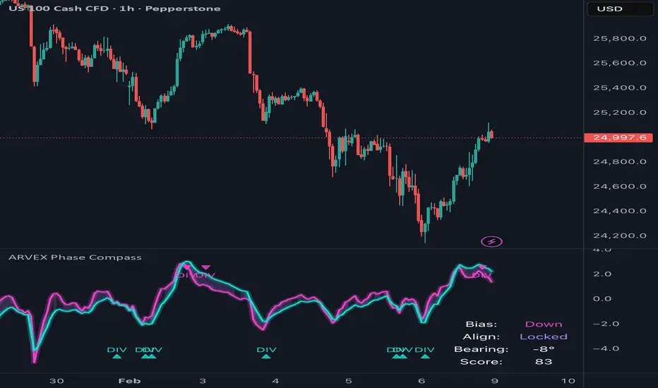 ARVEX Phase Compass is a phase-based oscillator that helps visualize trend momentum cycles, alignment, and potential turning points in a separate pane.