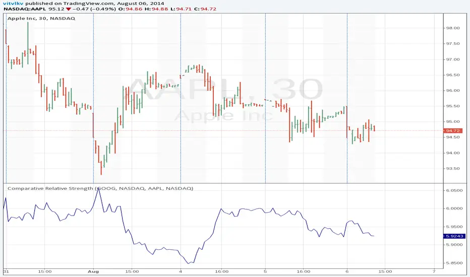 The Comparative Relative Strength indicator is calculated by dividing one security's price by a second security's price (the "base" security). The result of this division is the ratio, or relationship, between the two securities.
