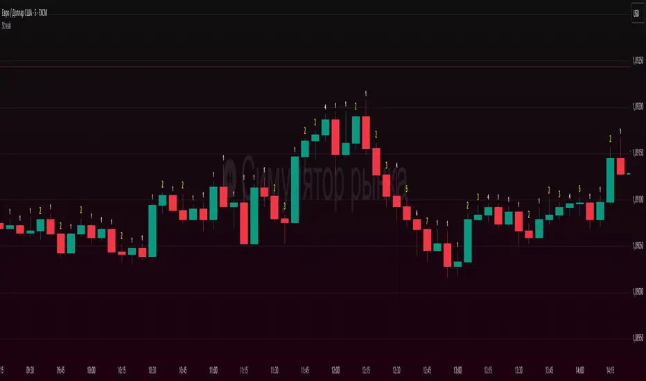 Counts the length of same-color candle streaks (consecutive bullish or bearish bars) and prints the running number above each bar: