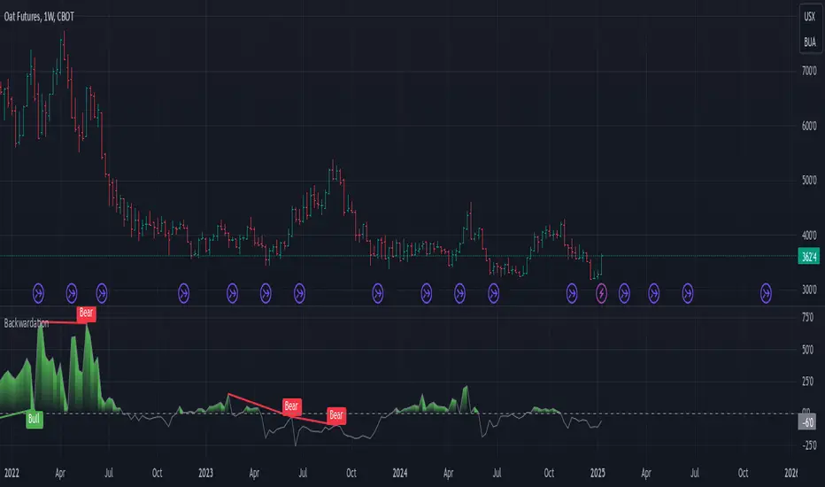 Backwardation (also known as premium) is most useful in commodities, but can work in other asset types as well. A period of backwardation occurs when the more recent contract is trading for more than the furthest contract. This can indicate an increase in demand for the commodity and cause prices to rise. As such, only bullish signals can be identified from this phenomena.