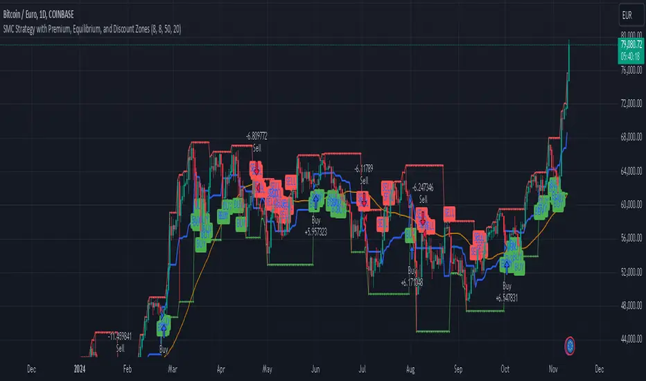 This Pine Script strategy is based on Smart Money Concepts (SMC) in according to Discount en Premium zones. Be careful: workst best with crypto! Here's a brief summary of what the script does:1. Swing High and Low Calculation: It identifies recent swing highs and lows, which are used to define key zones.